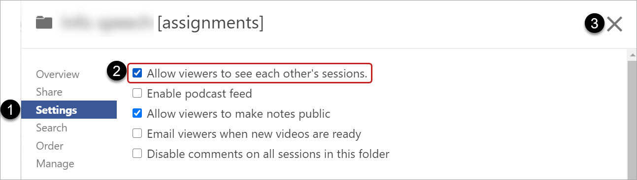 Click Settings [1], check the box for Allow viewers to see each other's sessions [2], and click the close X [3]. Students will now be able to view each other's videos submitted to the desired [assignment] folder.