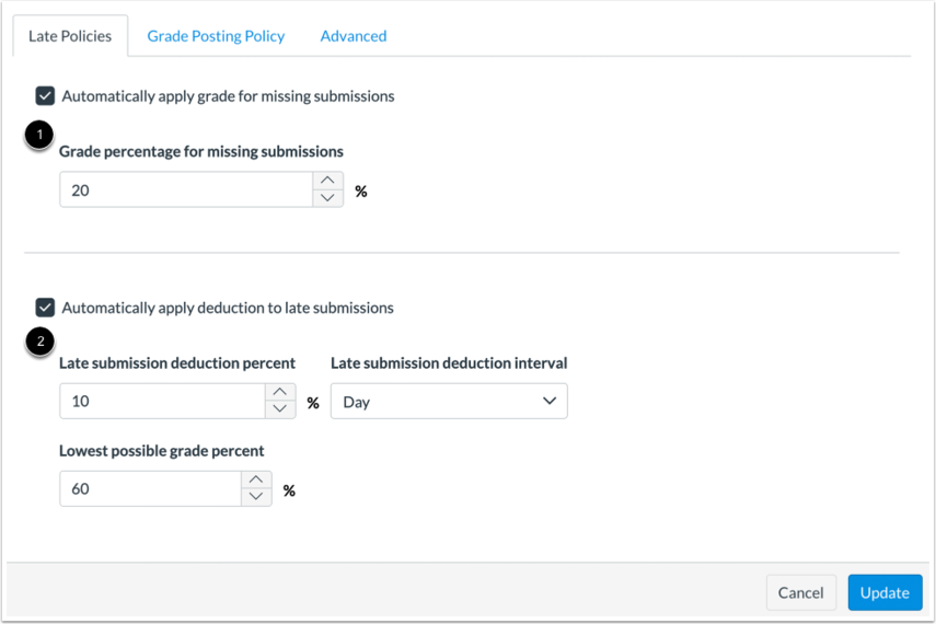 The Missing Submission policy allows you to automatically apply a grade for submissions labeled as Missing [1]. A submission is labeled Missing when the due date has passed and the assignment has not been submitted. The Late Submission policy allows you to automatically apply a defined penalty to submissions with a status of Late [2]. A submission is labeled Late when it is submitted past the due date. Additionally, you can define a threshold under which a student will not be scored, regardless of how late the submission is when submitted.