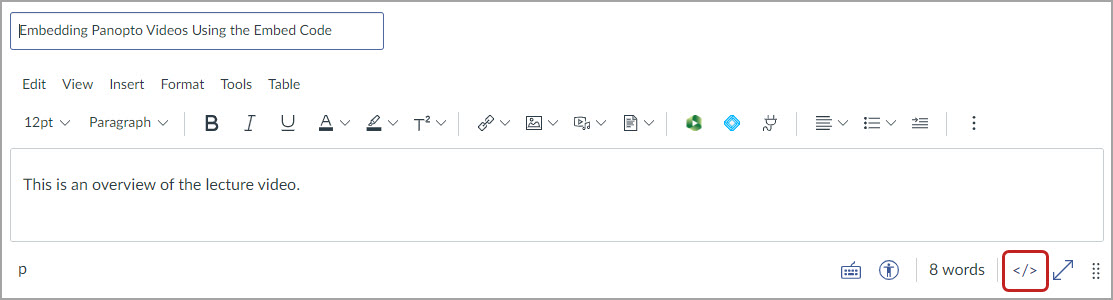 Go to Canvas, edit the desired Canvas item (page, discussions, assignment, or quiz), and click the HTML editor button to switch to the HTML Editor.