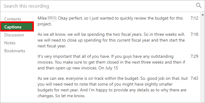The audio transcript from the Zoom meeting is found under Captions. Additional information about downloading the transcript/captions can be found at